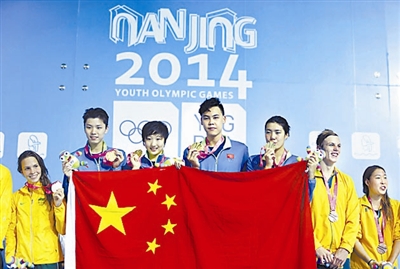 8月17日,中国队选手李朱濠、邱钰涵、余贺新和沈铎(从左二至右)在领奖台上。当日,在2014南京青奥会游泳项目混合4X100米自由泳决赛中,中国队以3分27秒02的成绩获得金牌。