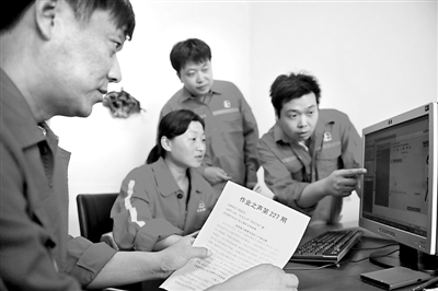 8月15日,河南濮阳中原油田采油一厂作业大队“作业之声”编辑组在商讨下期播报稿件的录制。该大队工会通过开播“作业之声”广播节目,在职工早班会间隙播放职工先进事迹,在职工中传播了正能量。白国强 摄