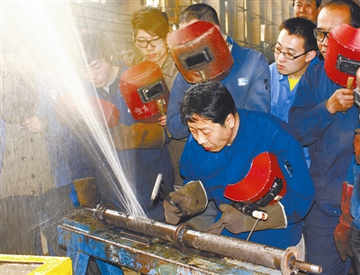 国家级技能大师、电焊工卢仁峰向年轻职工传授“顶压焊 ”绝活