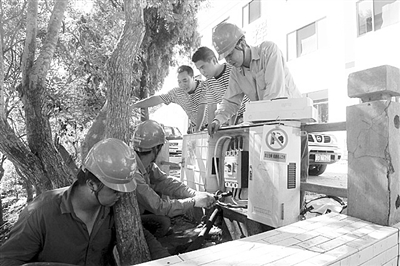 8月1日,浙江宁波宁海县供电公司职工在海军驻宁海某部军营帮助检查营地配电设施。国网浙江宁波市供电公司重视军民共建工作,经常为辖区内的部队开展安全用电检查和义务设备维护等保障服务。新华社发(邬晓刚摄)