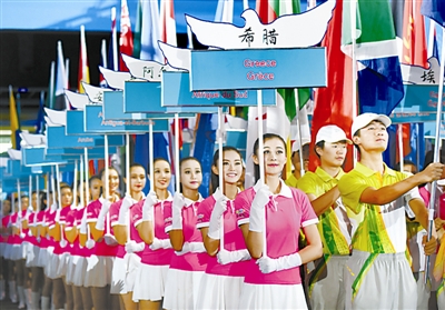 8月12日,礼仪志愿者参加青奥会开幕式彩排。 新华社记者 燕雁 摄