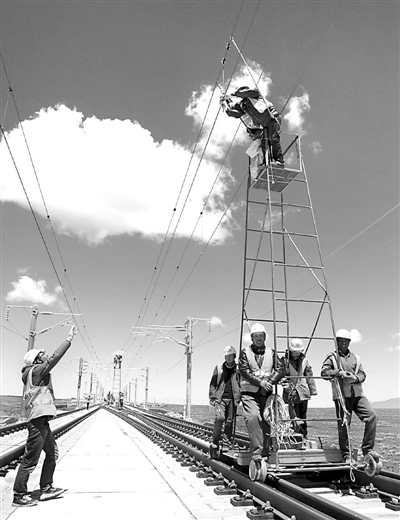 为了确保兰新高铁今年底前建成通车,被称为高铁“蜘蛛侠”的西安电化公司建设者们,克服高原高寒地区空气稀薄等困难,开展了劳动竞赛,大大促进了施工进度。倪树斌 摄