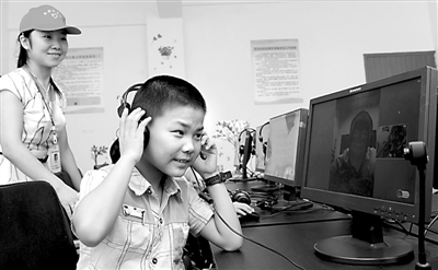 8月20日,在肥西县花岗镇青阳社区,一名留守儿童通过“亲情视频”与在广东东莞工作的爸爸对话。