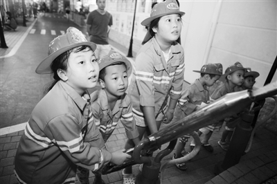 图为8月19日,想当消防员的孩子们正在进行职业体验。