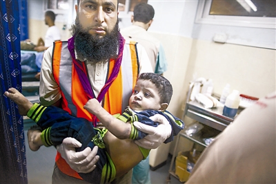 8月19日夜间,在加沙城医院,巴勒斯坦医疗人员抱着一名在轰炸中受伤的儿童等待治疗。