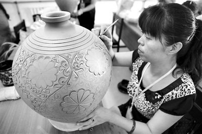 8月21日,参赛选手在第六届中国美术陶瓷技艺大赛进行刻花比赛。