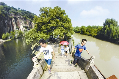 8月21日,游客在浙江绍兴东湖风景区内观看“阴阳河”景观。