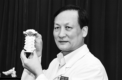 图为刘忠军教授在展示3D打印技术人工定制的枢椎椎体。