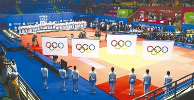 此次青奥会柔道项目特别打破了国籍的限制,安排了由多个代表队运动员组成的混合团体参加比赛,并以著名的柔道运动员的名字命名队伍。 新华社记者 任正来 摄