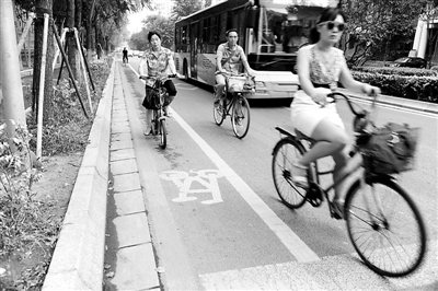 2014年8月18日,辽宁省沈阳市,最窄自行车道亮相沈阳和平区。据介绍,该条自行车道不足70厘米,早晚高峰令骑自行车的市民叫苦不堪,称“就像走钢丝练杂技”。 CFP供图