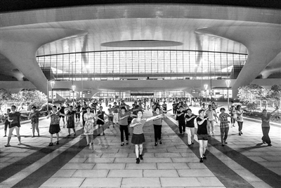 8月23日,一些周边居民在杭州东站西广场上跳广场舞。