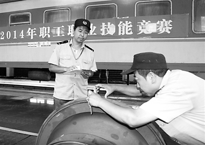 为全面实现兰新客专“接得上、管得住、创一流”的工作目标,不断提升客车车辆安全风险过程控制能力,加快培养高技能“客专”人才队伍,8月21日至22日,兰州铁路局兰州车辆段举办了2014年度职工职业技能竞赛活动。图为为选手测量客车轮对。