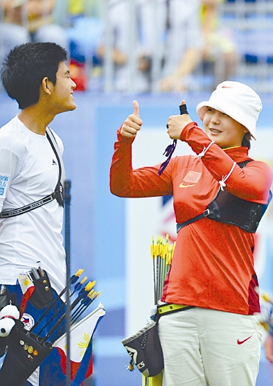 图为中国选手李佳蔓(右)在南京青奥会射箭混合团体决赛中向搭档菲律宾选手路易斯·加夫列尔·莫雷诺竖起大拇指。 新华社记者 普布扎西 摄