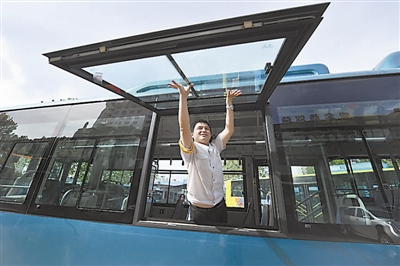 8月26日,济南公交K66路的一名司机在检查车厢安全逃生窗,该车的所有车窗已经完成“推拉式”改造。