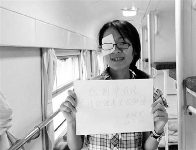 8月23日,中石化健康快车为孟照雯实施了白内障复明手术。刚刚走出火车医院手术室的她,激动地写下了“感谢中石化,为我的健康生活加油”的话语,而孟照雯也是中石化光明号健康快车治愈的第3万例患者。