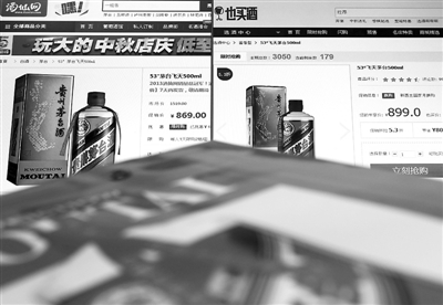 图为两家电商53度飞天茅台价格。本报记者 杨登峰 摄