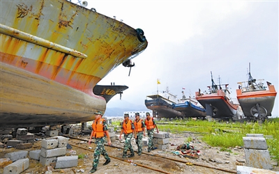 8月27日,边防民警在温岭市松门镇礁山港“三无船舶”扣押点巡查。