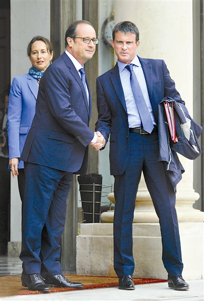 8月27日,法国总统奥朗德(前左)和总理瓦尔斯(右)在巴黎总统府召开的第一次内阁会议后亮相。
