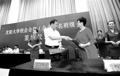 8月28日,辽宁省沈阳市,沈阳大学在体育馆会议中心举行校企合作签约仪式。仪式上,校长李峰与北方重工集团有限公司、沈阳远大企业集团等12家企业签订了企业命名班级的合作协议。根据协议,学校将与上述企业共同建立“北方重工”班、“远大”班、“沈阳地铁”班等12个班级。