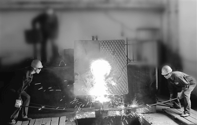 随着鼓风机的阵阵劲吹,炉膛里的火苗呼呼地往上蹿,一块块破铜烂铁熔化成水。铸造工拿着长长的铁钎,在炉膛里来回搅动,以使铁块熔化达到最佳效果,豆大的汗珠顺着脸庞往下流淌,他们全身都湿透了。