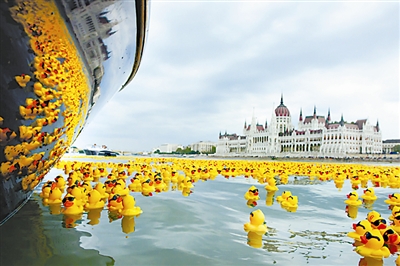 8月31日,在匈牙利首都布达佩斯,数万只橡皮鸭从国会大厦前漂过。当日,一场带有慈善性质的橡皮鸭漂流比赛在多瑙河上举行,约有5.2万只橡皮鸭漂浮在多瑙河上,场面蔚为壮观。
