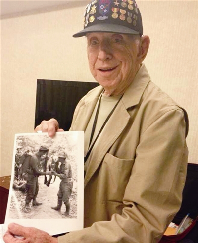 93岁高龄的美军老兵伯纳德·马丁先生手持当年参战时照片在展览现场留影。