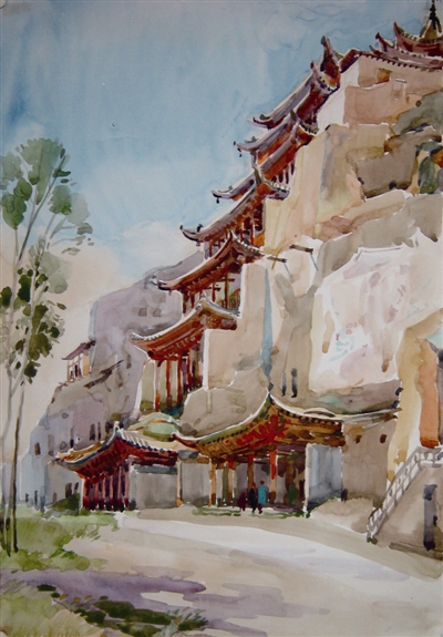 吴良镛的建筑人生始终伴随着对绘画艺术的挚爱。他在绘画技巧上师法正宗,形成了坚实的造型功力,更把绘画作为观察生活与自然、感受建筑与环境的方式,状物为着抒情,写景同时写心,在行旅中国和踏访世界之际,总是笔耕不辍,以画家和建筑师二者兼备的眼光,画出自己的敏锐感受。无论是水彩还是素描、速写、水墨,取景构图都十分大气,色彩色调十分高雅,探索了西洋绘画块面造型与中国艺术线条表现的两相结合,以水色交融的语言画出浓郁的诗意,呈现出典雅的格调。