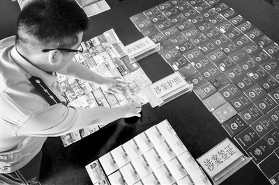8月31日,广东省边防总队江门支队干警在整理查扣的100本护照、48张伪造巴西签证及大量银行卡等涉案物证。