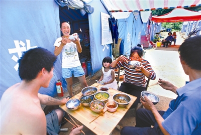 9月7日,云南省鲁甸县龙头山镇灰街子集中安置点,谢长富(右)到女儿谢维雨家的帐篷里和她们全家一起吃饭。