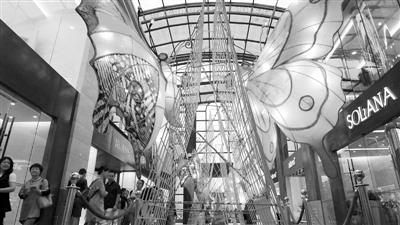 在2014年中秋节期间,北京市开展了多项文艺演出、民俗文化展示以及文化旅游等各类群众文化活动。图为9月7日,北京蓝色港湾国际商区展出的台湾手工艺术蝴蝶花灯吸引了游人的目光。中新社供图
