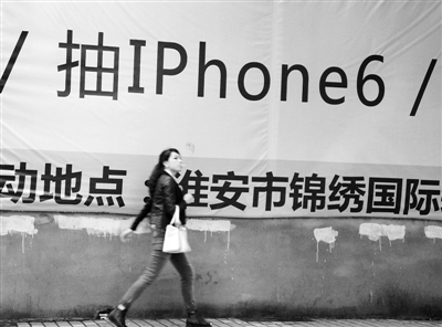 2014年9月初,江苏淮安淮海广场,一名行人从商家购物抽iphone6的广告前走过。苹果iphone6还没有发售,商家已看准商机,以购物抽苹果手机来吸引人气。贺敬华/东方IC