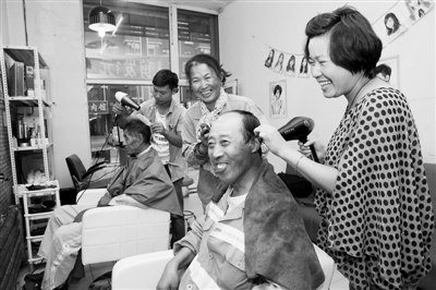 图为沈玉田和夏畅夫妇正在为环卫工理发。守辰/CFP