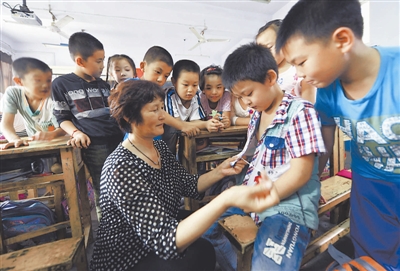9月9日,山东省邹平县临池镇南北寺小学房梅香老师给结对的三年级学生高云哲缝纽扣。近年来,针对留守儿童多的状况,该校教师与百余名留守儿童进行牵手结对。对结对的留守儿童逐一建立儿童成长档案,适时进行心理辅导,让留守儿童在爱的关怀中健康成长。 新华社发 董乃德 摄