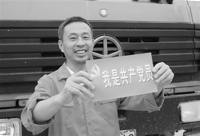 9月10日,河南油田采油一厂生产准备大队党总支为9个“共产党员示范岗”和26台“党员先锋车”举行授牌仪式。这是该大队开展“创新型支部建设年”活动中的一项重要内容,102名党员公开身份,主动接受用户和群众监督,更好地发挥党支部的战斗堡垒作用和党员的先锋模范作用。图为该大队特车二队“党员先锋车”驾驶员刘彦文公开身份展示“我是共产党员”。