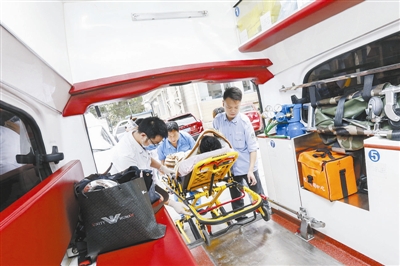 9月12日,在北大医院急诊科,陆医生和担架员、司机一起将病人送上急救车。今年9月13日是第十五个“世界急救日”。急救医务人员工作强度较高、收入水平不高,因此流动性很大,但医生们说,支持他们一直从事急救医生工作的动力来自患者和家属的信任。 新华社记者 张玉薇 摄