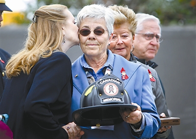 9月14日,在位于加拿大首都渥太华的加拿大消防员纪念园,殉职消防员马丁·沃尔什的遗孀瓦莱丽·沃尔什(前右)接受朋友的安慰。