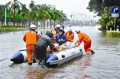 9月16日,救援人员在海口长堤路使用冲锋舟向附近医院运送物资。受台风“海鸥”影响,海口市出现海水倒灌,引起严重内涝。 新华社发 (杨冠宇 摄)