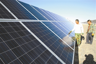 2014年8月26日,甘肃省确定省内多家风电项目和光伏发电项目的上网电价。图为甘肃高台县高崖子滩光伏产业园工人正在检查光伏发电板。王将/东方IC
