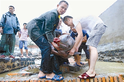 为了让这条海豚能够得救,在风雨中,后葛村的村民们自发组织起来将受伤的海豚送回大海。