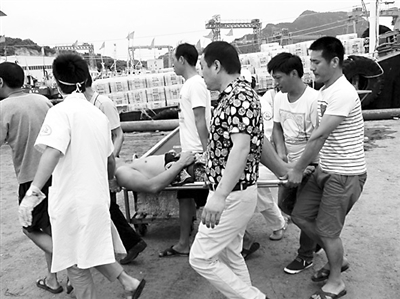 9月15日,浙江温岭市石塘镇礁山港码头,温岭第四人民医院“海上飞虎队”的医疗人员将浙岭渔船受伤船员救上岸。当天,这条渔船在东海作业时,湖南籍船员张某被小锚横扫到腹部受伤。林赛君 /CFP