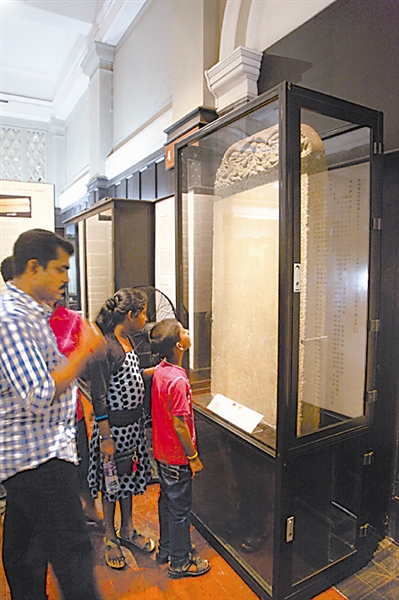 9月15日,在斯里兰卡首都科伦坡,游客参观斯里兰卡国家博物馆展出的郑和碑。
