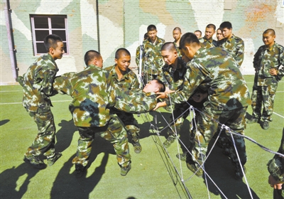 9月15日,吉林边防对2014年入伍新兵进行心理行为拓展训练,培养新兵应对高强度训练的心理承受能力及自我减压方式。图为入伍新兵在进行考验统筹指挥及团队协作的拓展项目“穿越火线”。新华社记者 许畅 摄