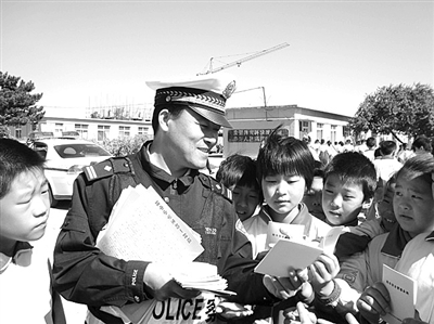 连日来,辽宁阜蒙县交警大队组织民警对辖区所有学校校车进行摸底、排查、登记,对学校的校车安全情况进行详细了解。图为交警向学生发放校车安全宣传手册。李德文 摄