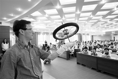 9月17日,美国教授为北京五中分校学生演示物体旋转。当日,来自美国哈佛大学、麻省理工学院等院校的十几名大学教授在该校参加“科学家进校园”活动。活动中,美国教授为学生们演示了火箭升天、物体旋转等科学表演,并带领学生参与科学实验,让他们在动手和动脑的结合中体验“玩转”科学的乐趣。 新华社发 周良 摄
