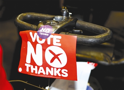 图为反独立阵营支持者将“不,谢谢”的标语贴在轮椅上。新华社记者 韩岩 摄