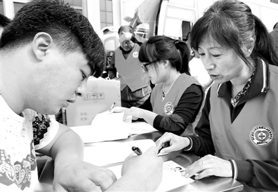 9月22日,秦皇岛港的职工在填写无偿献血登记表。