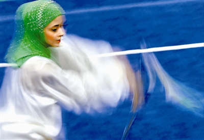 9月23日,在仁川亚运会武术项目女子比赛中,参赛选手时而静若处子,时而动若脱兔,宛如武林女侠一展身手。图为伊朗选手哈米德在女子太极剑比赛中。