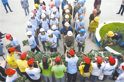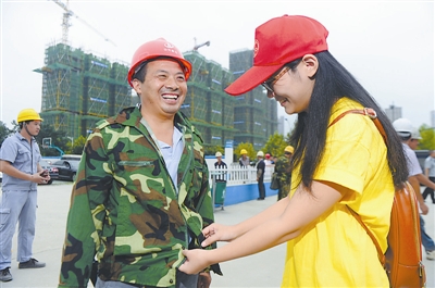 9月23日,安徽省合肥市合肥工业大学的志愿者带着从全校无偿征集来的近500套军训服来到临近工地,送给工地里的建设者。高校军训服往往存在使用“一次性”的问题。此次军训服送工地活动既让较新的军训服可以再次使用,也给工地里的建设者们送来了可供秋季使用的衣服。