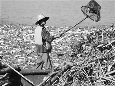 9月23日,三峡库区湖北秭归县茅坪镇,长江三峡水库漂浮垃圾聚集,环卫工人顶着烈日在打捞漂浮物。