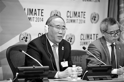 9月23日,中国国家发展和改革委员会副主任解振华(左)在纽约联合国总部参加新闻发布会。